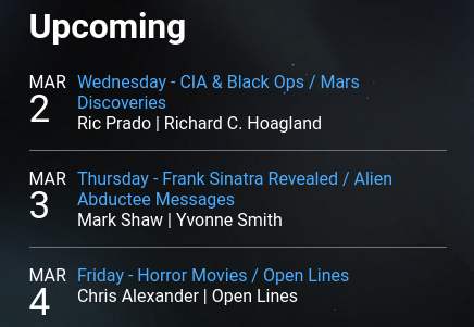Richard C. Hoagland is scheduled to be on C2C with George Noory tomorrow.