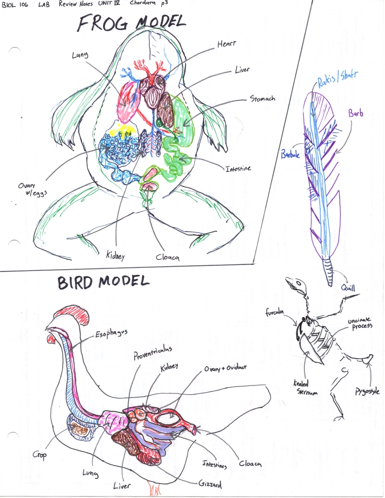 I think I did pretty good;  this one was on Chordates (Unit IV) and if I got a 90% or higher I will not have to take the comprehensive (Units I-IV) portion of the Final Lecture Exam on Tuesday next.  I feel pretty good about it, even though I made up some answers:  For instance, in Tunicates I claimed that the arrow was pointing at the "Pharyngeal Net" and not the "Tunic" (I believe I used the words 'most probably') and I do not believe that birds possess a "Supra-pectoral" muscle that serves to raise the wings...  Plus the Study Notes I made (see below) which count for either six or a half-dozen "bonus points" (My Zoology instructor is a nice hawt young vegetarian Liberal-type, so kind!) might actually put me in >100% territory.