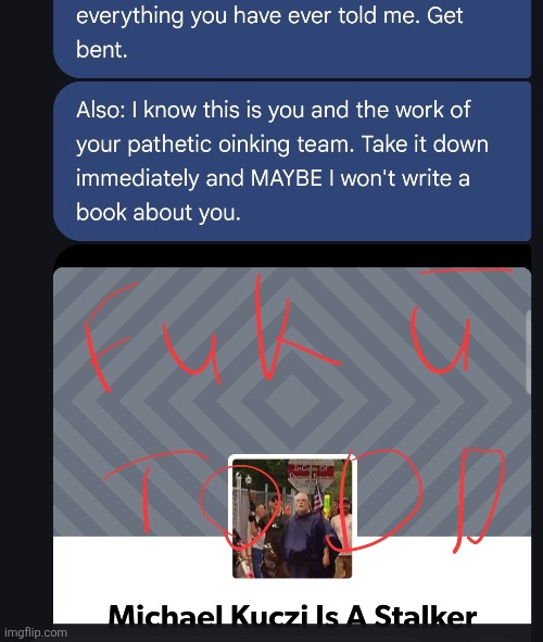 Of course that was several years ago. Which instantly. I don't remember hearing any updates from you about and I don't remember hearing you saying anything about. Oh by the way Clayton just raped Anita last night, cuz I guess he didn't and then I guess I didn't hear from anybody ever again since you needed to spread a narrative and made me look back because that's what you wanted to do rather than explain to me what the f*** was going on, so I'd be happy to delineate all this stuff to you and explain it to a returning or a judge or my maker, my creator and my God, but I don't really need to do any of that stuff because since I'm pretty sure you can figure out that you're f****** caught, and I don't really need to spell your whole f****** life story to you. But not only are you caught, I don't really care to f****** deal with you at all. I really never did since it turned out that most for everything nice you were said about yourself is why and you should probably look out to how to be a better person. You're a sick of your daughter, but don't worry, I'll probably take care of her in some way while you're out of the picture in prison, a little respectful like.