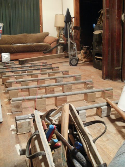 Now THAT was probably a mistake!  Due to multiple factors (one-hundred plus year-old house settling, lack of a twelve-foot straight edge {~four foot was the best I could muster on that front} and a dumb box of hammers) this "leveling" of the base would probably have best been done sober and on a full stomach (my pot-roast dinner gently simmers in the oven as I type).